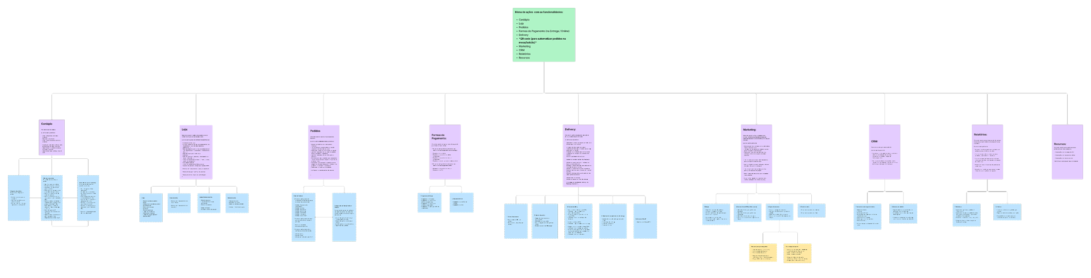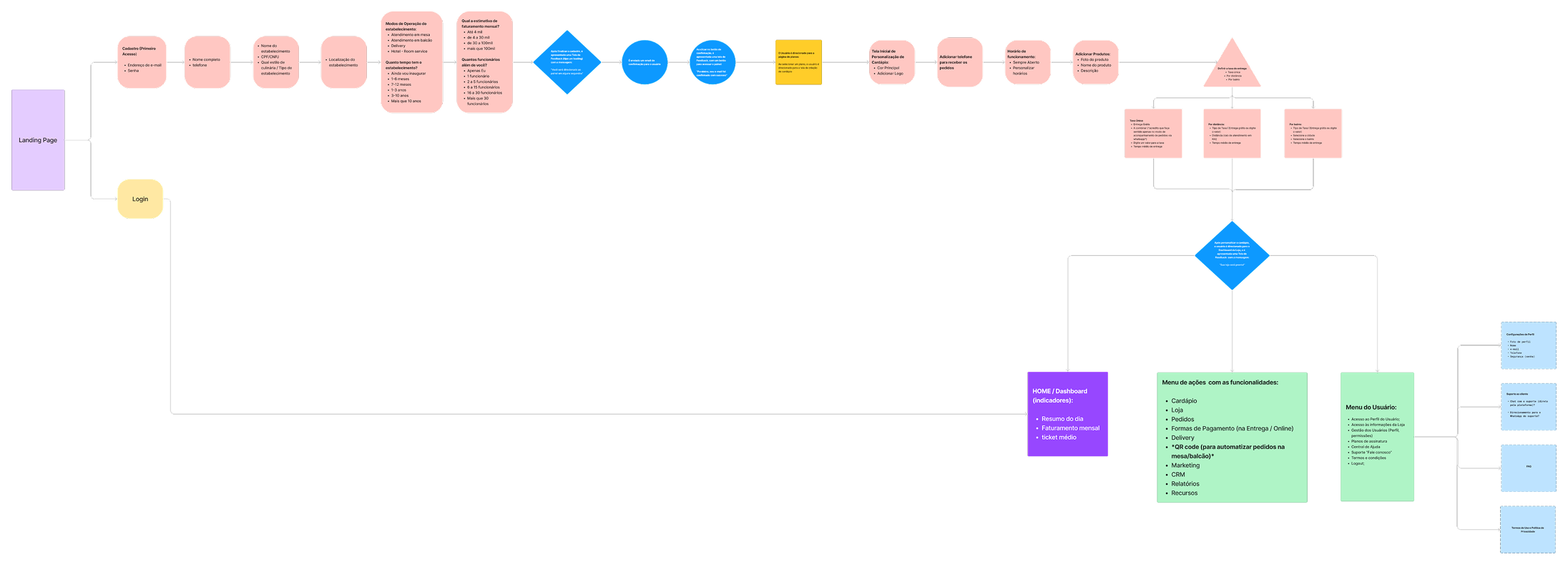 Após a etapa de pesquisa e benchmarking, fiz o levantamento das principais funcionalidades da plataforma com um formato de fluxograma, possibilitando a visualização macro das aplicações e auxiliando na mensuração do esforço para o desenvolvimento.