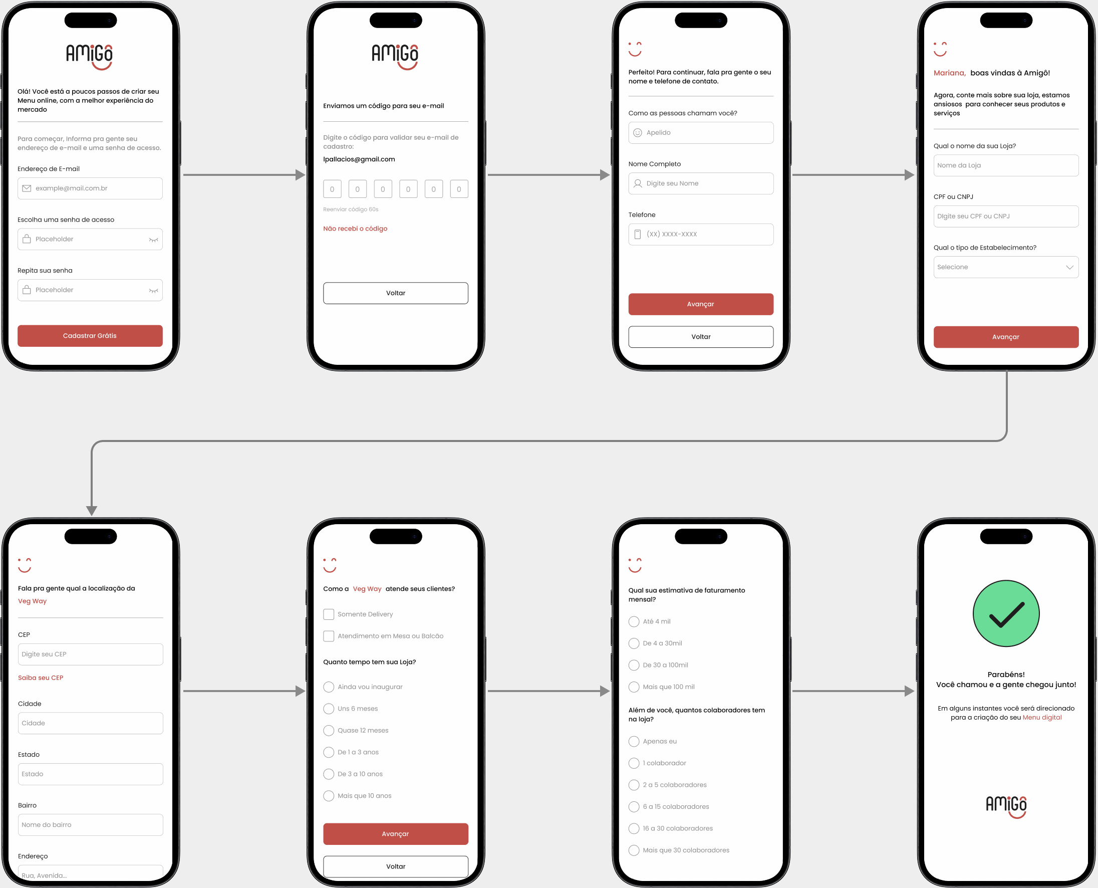 Com o propósito de proporcionar ao usuário uma experiência mais fluida e consistente, sugeri que o cadastro da loja fosse feito passo a passo, com as informações essenciais em cada tela.
