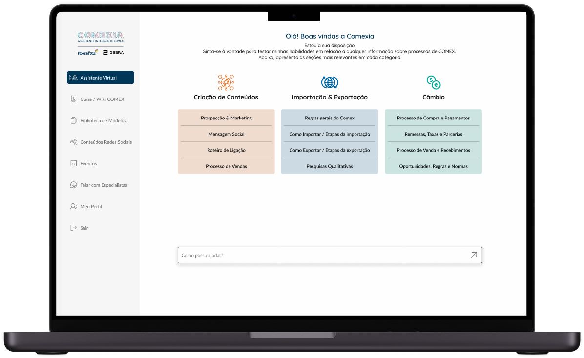 Desenvolver uma Assistente Virtual Inteligente (utilizando IA - API do Chat GPT) treinada com a base de conhecimentos em COMEX para auxiliar, com agilidade e precisão, as empresas e parceiros na resolução de dúvidas, otimização de processos, criação de conteúdos de prospecção, roteiros de vendas e rotinas de novos negócios.