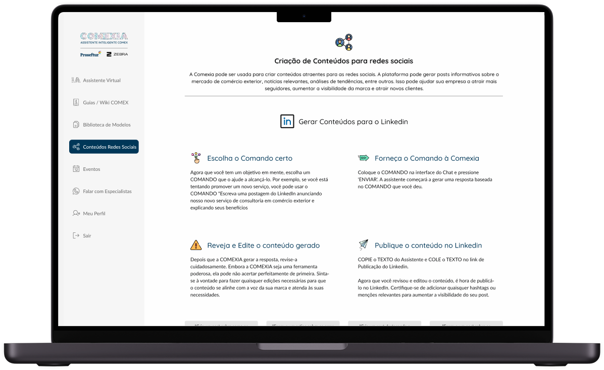 Auxiliar na criação de conteúdos consistentes para o negócio foi o ponto chave da aplicação. Além da assistente virtual, criamos um guia passo a passo para orientar o usuário a extrair o máximo de desempenho da AVI.