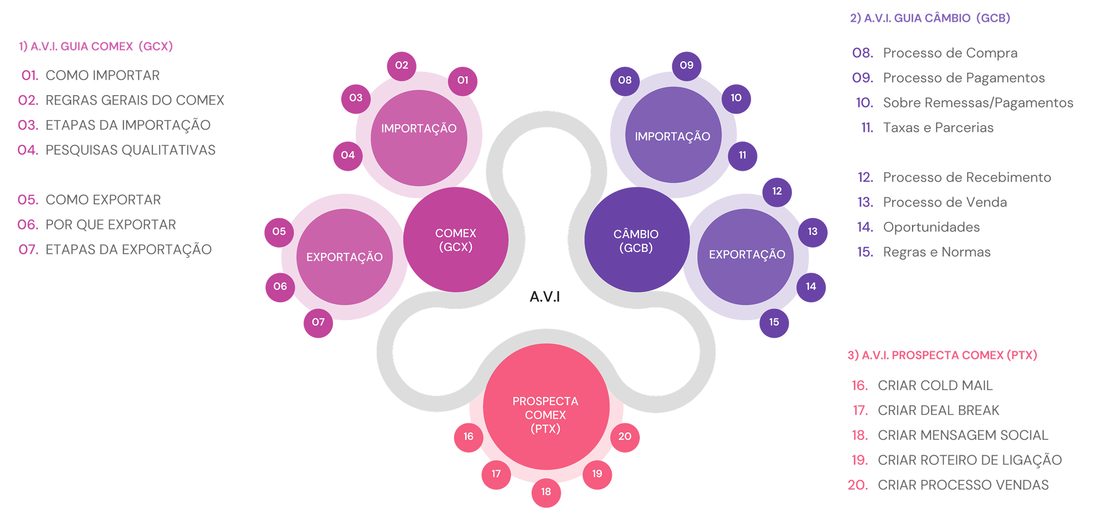 Todo o conteúdo foi cuidadosamente elaborado em colaboração com especialistas em COMEX. Como resultado, criamos um mapa mental que utilizamos para organizar os tópicos e apresentar de forma clara aos stakeholders.