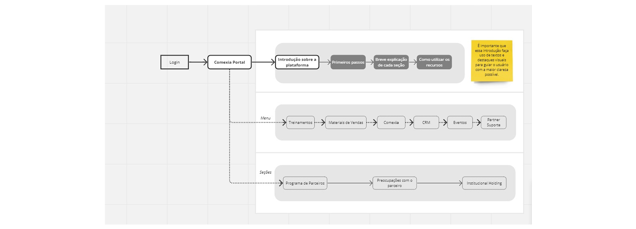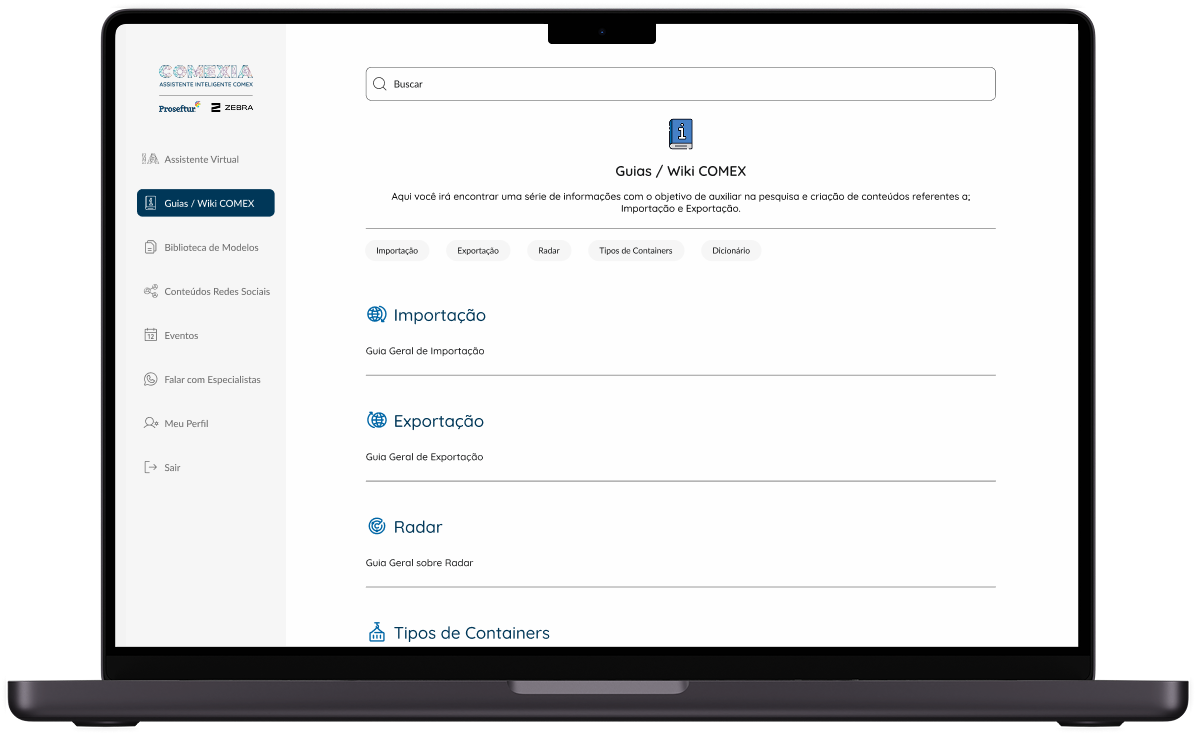 Todo o conteúdo foi cuidadosamente elaborado em colaboração com especialistas em COMEX. Como resultado, criamos um mapa mental que utilizamos para organizar os tópicos e apresentar de forma clara aos stakeholders.