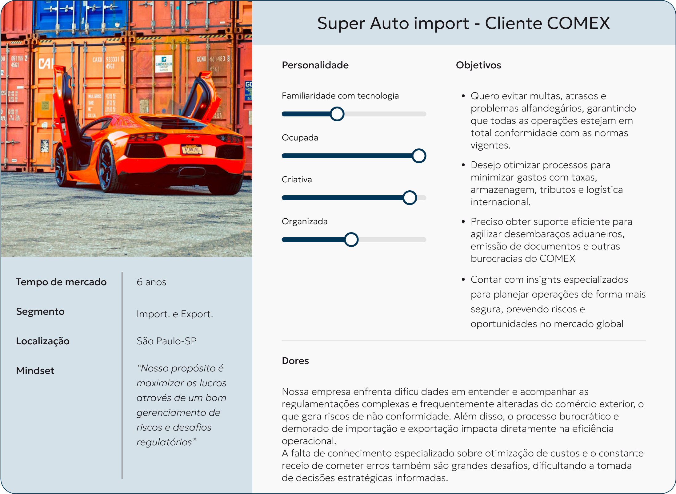 Trabalhar em um produto com o qual eu não tinha conhecimento nenhum sobre a área foi um grande desafio. Foram necessárias horas de pesquisa para mergulhar no universo do comércio exterior e compreender melhor seus processos. Colaborar com um time altamente dedicado foi fundamental para o desenvolvimento do produto, além de ser uma experiência enriquecedora para o meu crescimento profissional.